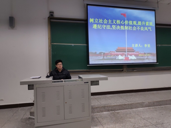 为贯彻全国教育大会精神,根据学校统一部署,beat365党总支书记李旻于12月9日18:00在红河九阶为2107级全体学生讲以“树立社会主义核心价值观,提升素质,遵纪守法,抵制不良风气”的专题思政课,辅导员卢德强主持。