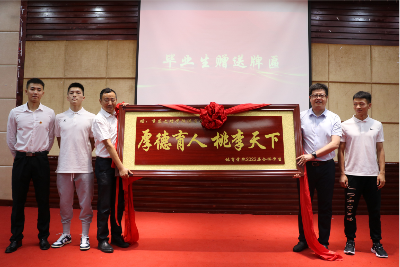 活动共有九项议程。首先是表彰2022届毕业生考研录取学生,学院党总支副书记、院长唐建忠,学院党总支书记、副院长李旻,为他们颁奖;第二项议程是是表彰2022届市级优秀毕业生,副院长王勇为他们颁奖;第三项议程是学院党总支副书记、院长唐建忠向2022届毕业生校友联络员发放聘书;第四项议程是教师代表钟利发言,向顺利完成学业的2022届毕业生们表示了祝贺并提出殷切希望;第五项议程是2019年级学生代表吕冰宇发言,对师兄师姐表示祝贺、祝愿和感谢,并将传承体育精神,努力奋斗,不负韶华;第六项议程是毕业生代表廖小林致感恩辞,感谢母校四年来的辛勤培养;第七项议程是毕业生向beat365官方网站赠送牌匾,学院党总支副书记、院长唐建忠,学院党总支书记、副院长李旻上台接牌;第八项议程是学院党总支副书记、院长唐建忠讲话致辞,盘点了学院近年来取得的丰硕成果,为毕业生送上了美好的祝愿;最后一项议程,毕业生代表向老师献花,向老师们表达了衷心的感谢和最真挚的祝福。