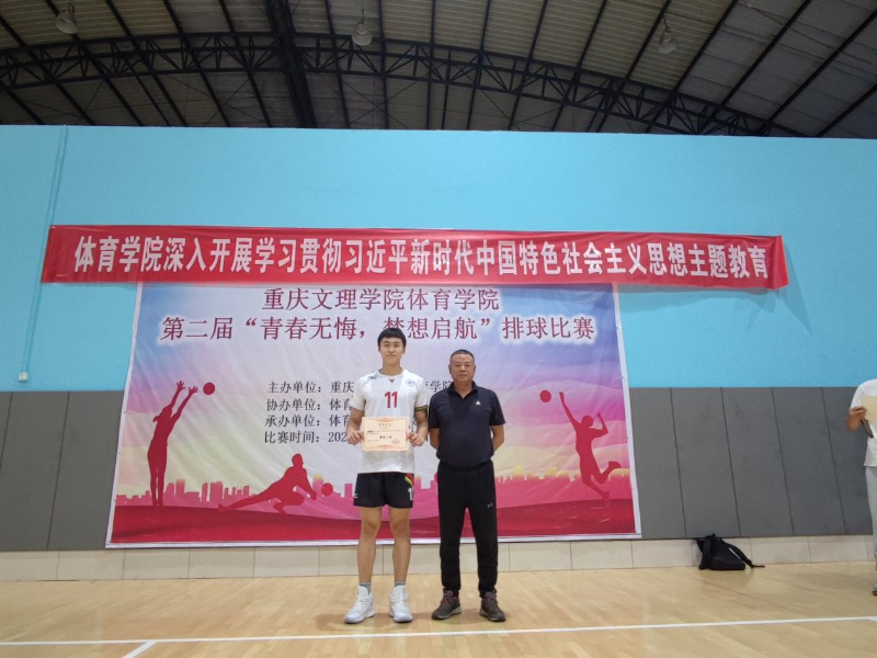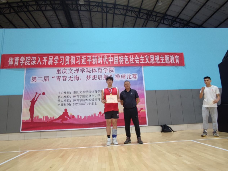 2023年5月21日下午进行比赛闭幕式,首先由主持人宣布本次比赛结果:2021级运动训练代表队荣获冠军、2020级运动训练代表队荣获亚军、2022级运动训练代表队荣获季军;最有价值球员:莫逸凡;最佳攻手:韩国锋;最佳二传:胡小迪;优秀女运动员:吴晓、帅梦洁;优秀裁判员:胡鹏、李争、吴晓、周地鑫、曾将锐、刘刈诗林、韩国锋;然后卢德强、程大力、张谦分别为获奖运动员和裁判员颁奖,最后学工办副主任、团总支副书记卢德强致闭幕词并宣布比赛结束。