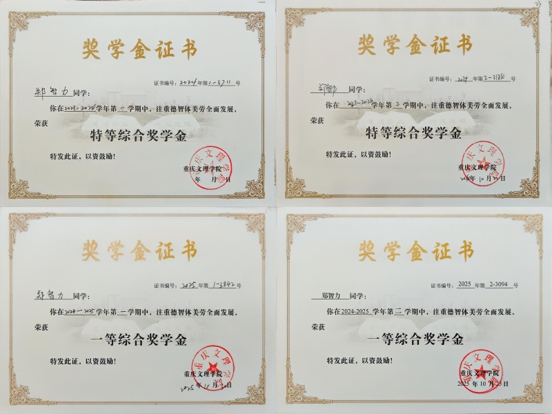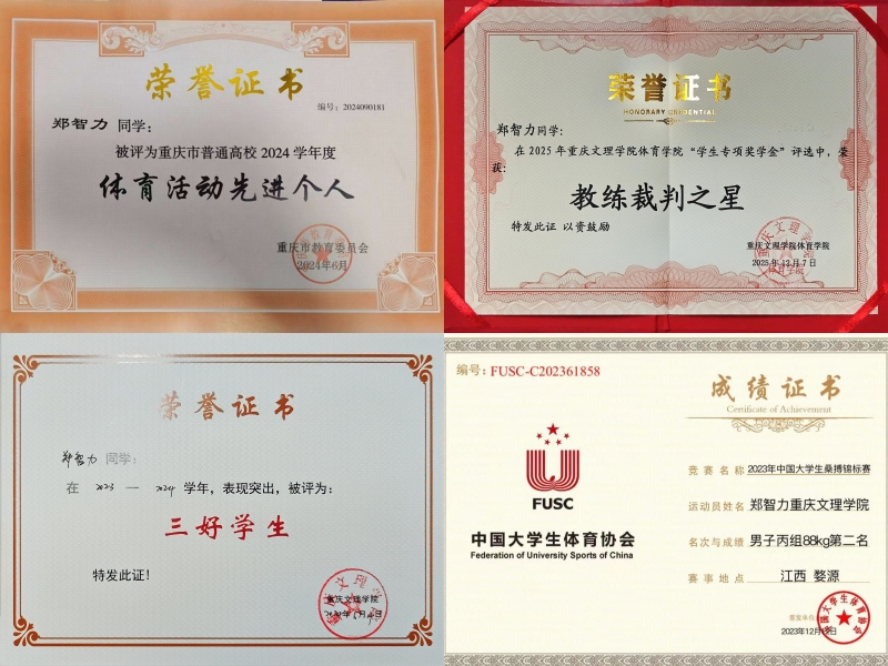 赛场之外,郑智力更是名副其实的“学霸选手”。思想上积极上进,向党组织靠拢,入校递交入党申请书,参加党校学习,顺利以优秀的成绩完成党校结业考试,始终以高标准要求自己,将“严谨、负责”的执裁态度,也融入了日常的校园生活与思想建设中。学业成绩始终稳居前列,入学至今保持全专业前10%,先后荣获“重庆市体育先进个人”、重庆文理学院“三好学生”、重庆文理学院“谭令校友奖学金”;重庆文理学院特等奖学金2次;重庆文理学院一等奖学金2次。